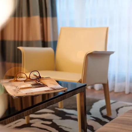 Rooms come with view of the city. The elegant furniture is ideally combined with carpeted floor.